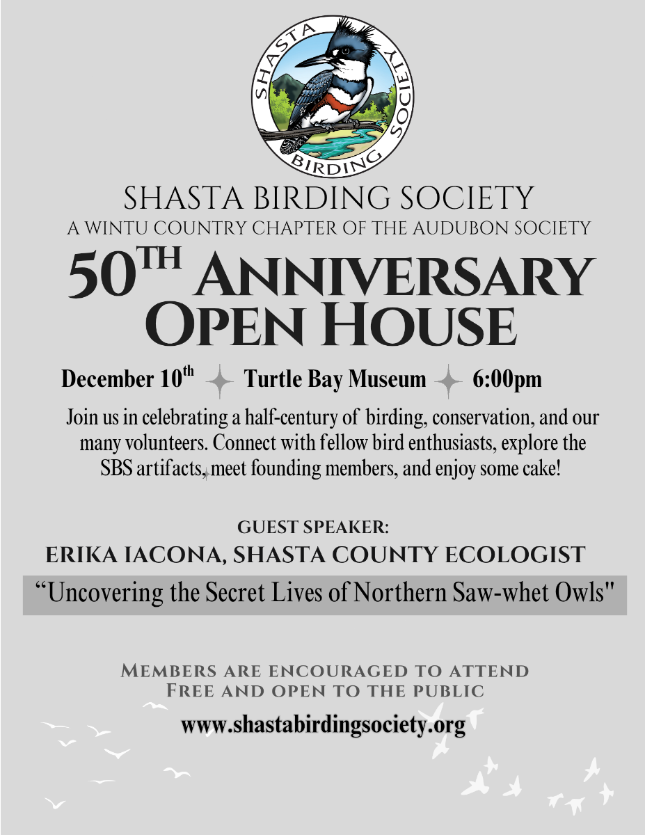 Shasta Birding Society is inviting all members, past and present, to celebrate our 50 years in the greater Shasta County area and the North State of California. Our event is limited to two hours, including: displays of artifacts and memorabilia, testimonies and time for sharing, cake and beverages, and an exciting presentation by Erika Iacona.